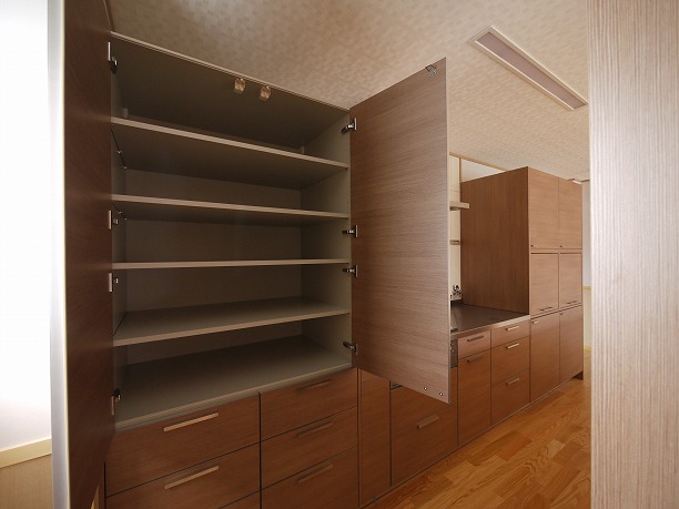 中央のキッチンの横は背の高い収納になっていて、ダイニング側からは食器などを収納できる。その反対側は冷蔵庫収納で、他ではあまり無い工夫がされている。
