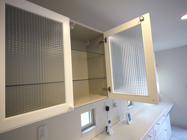 カップボードの扉は小ブロック調のガラスでどこか懐かしさを感じる。