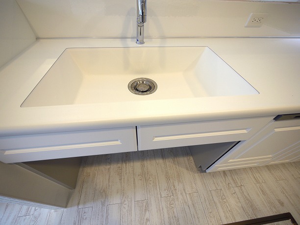 高圧メラミン素材のワークトップも、人造大理石のシンクもホワイトで統一されている。